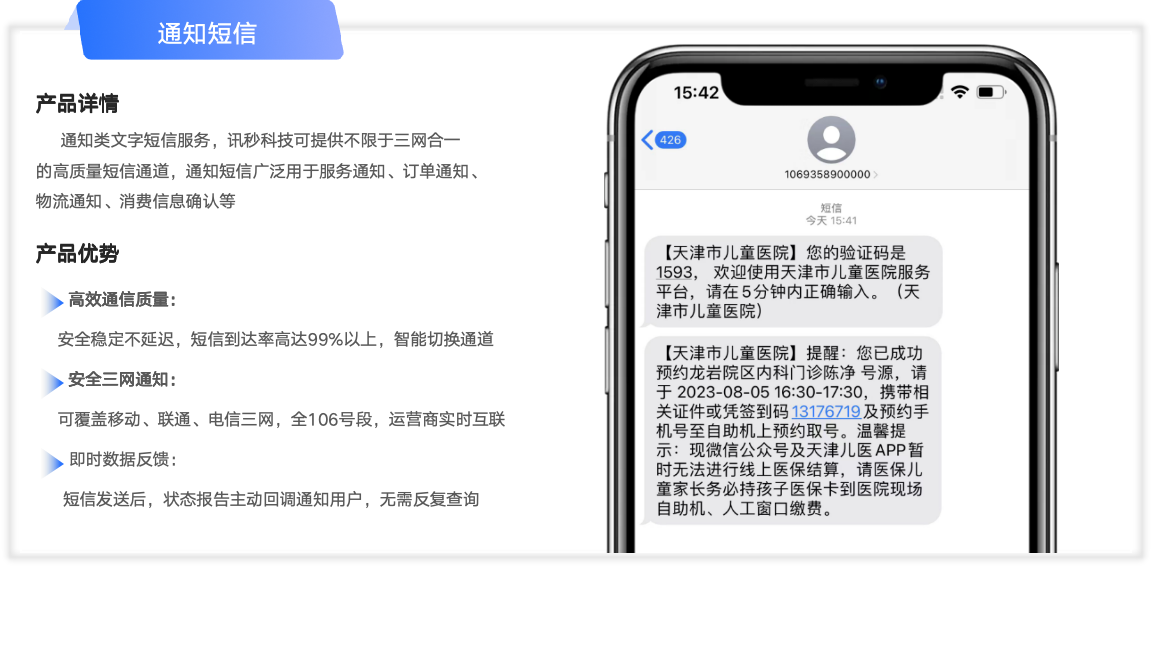 为企业提供向用户实时发送订单状态、会议通知、物流信息、动账提醒、政务提示等各类通知信息的服务,搭建B2C即时沟通的桥梁,优化用户体验,为企业提升运营效率提供有力支撑。