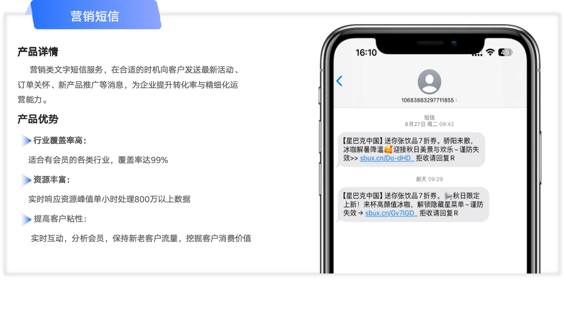 为企业提供面向会员的活动邀请、优惠促销、客户关怀等信息发送服务,帮助企业提升客户服务效率,提高品牌营销、拉新获客的商务拓展能力。